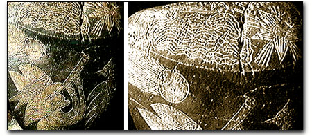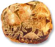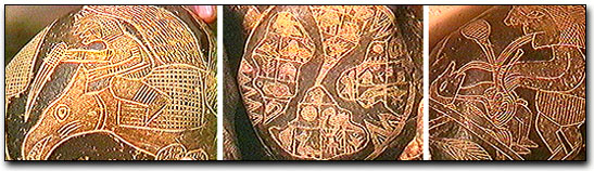 Ica Stones : are located high up in the Andes Mountains, the "Rockies" of South America, in one of the more arid regions of Peru called Ica. They comprise of a number of rocks which very in size from a tennis ball to twice the size of a football. They are made out of andesite, this is a very hard mineral that would be difficult to carve with primitive tools. These stones are also covered with a natural varnish created by bacteria over thousands of years. It is by scraping away this dark natural varnish to reveal the lighter mineral beneath that the etchings are made. Some examinations of the stones show that the grooves of the etchings also bear traces of additional varnish, indicating that they are very old. They contain pictures of primitive fish, ancient Indians using what can only be described as modern technology and dinosaurs. These images are all etched by hand. Although highly fascinating, the age of the rocks cannot be verified due to a lack of organic material, this tends to add to their mystery.
